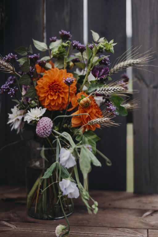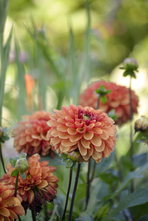 En net dahlia, hvor solnedgangens brændende farver – gul, orange og murstensrødt – kombineres på kronbladenes for- og bagsider. Den fyldte blomst minder om en pompomdahlia, og den første følges af mange flere.