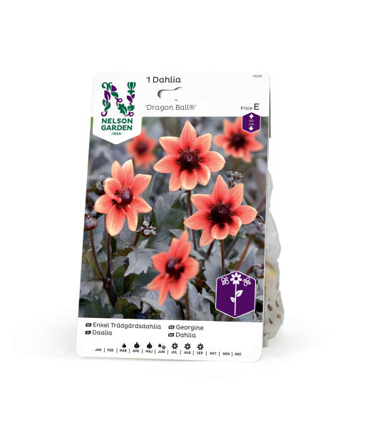 Smukke orange blomster i bløde toner mod de mørkeste grønne blade - denne lave dahlia er en smuk kontrast som pryder i alle bede og krukker.