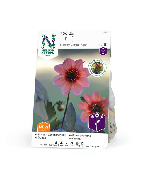Tryllebindende, næsten hypnotisk, enkeltblomstret dahlia med en mørk midte og store abrikosrosa kronblade. Blomsten kan blive op til 9 cm bred og er smuk i både potte og blomsterbed.