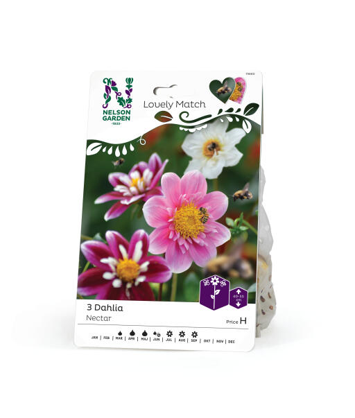 Tre søde dahliaer i rosa og hvidt med to rækker kronblade. De åbne blomster tiltrækker bier, humlebier og sommerfugle. Vokser lavt og kompakt og er derfor velegnet både i potter og som kantplante. De lange stilke gør dem også gode som snitblomster.