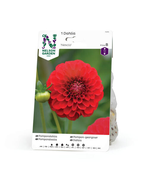 En dahlia med ildrøde, tæt fyldte og helt runde blomsterkugler. Vidunderlig i bede, gerne flere i grupper.