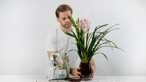 1. Omplant orkidéen, når potten er fuld, eller rødderne hænger ud over kanten. Gør det gerne i løbet af plantens hvileperiode, når den ikke har blomster, og brug både indre og ydre potte.