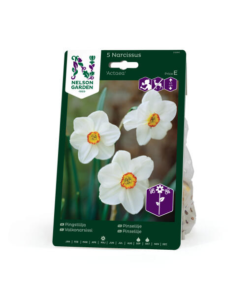 'Actaea' er en klassisk, duftende pinselilje. Det er en gammel sort, prisbelønnet tilbage i 1919. Blomster med hvide bægerblade og en lille gul tragt med rød kant. Et must i sommerhuset! Anses for mindre appetitlig for rådyr, hare, kanin og mosegris.