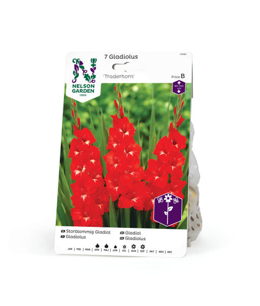 Storblomstret gladiolus af ypperste kvalitet. Skinnende røde, elegante blomster på høje stilke. Velegnet i bede, gerne flere i grupper. Også i store krukker og frem for alt fantastisk i kæmpebuketter.