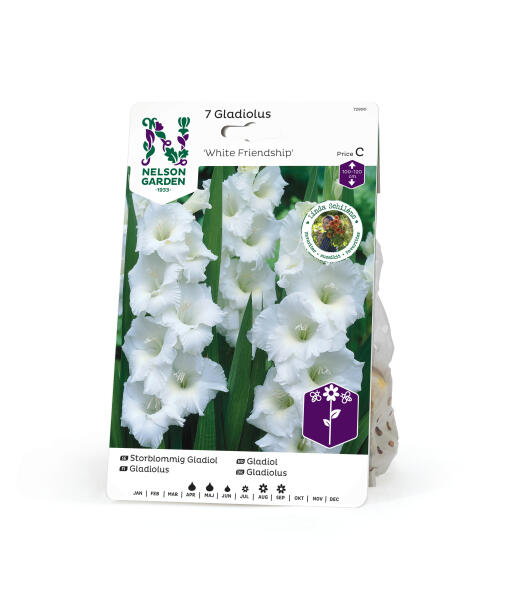 'White Friendship' er en storblomstret gladiolus af høj kvalitet. Glimrende som snitblomst, men bør så høstes, når den nederste blomst er begyndt at springe ud. Kan kræve nogen opbinding.