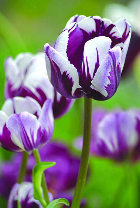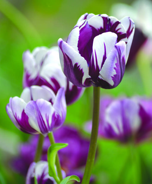 Ja, denne flotte triumftulipan kunne sagtens sammenlignes med et flammende flag som vajer i vinden i lilla og hvidt. Blomstrer længe og er lige så trofast i bedet som i den elegante forårsbuket.