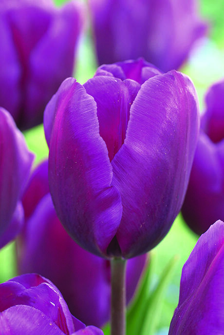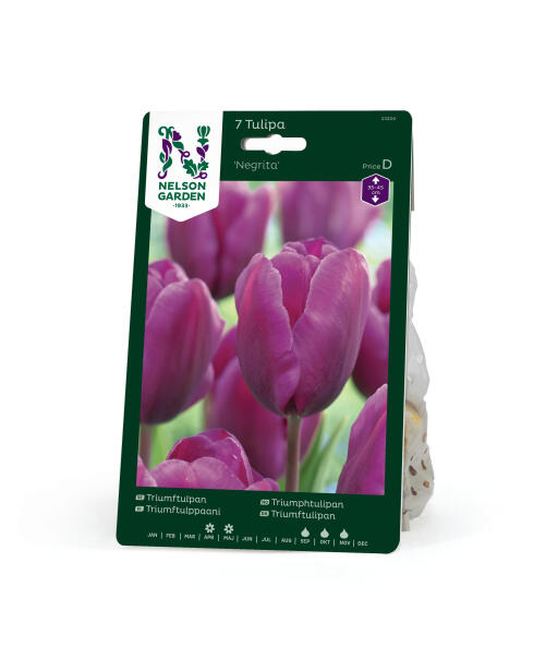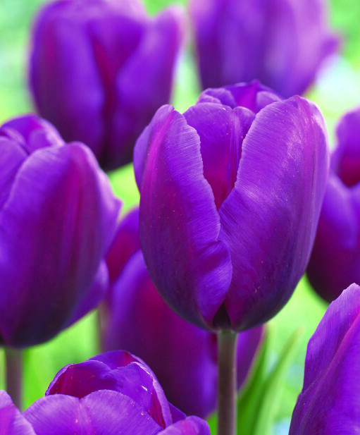 Blomsterbladene hos denne tulipan flammer i purpur og lilla. Karakteristisk for triumftulipanen er den stabile stilk og den smukke blomsterform. Blomsterne plejer at stå længe. Særdeles god som snitblomst.