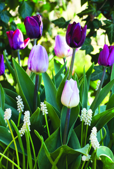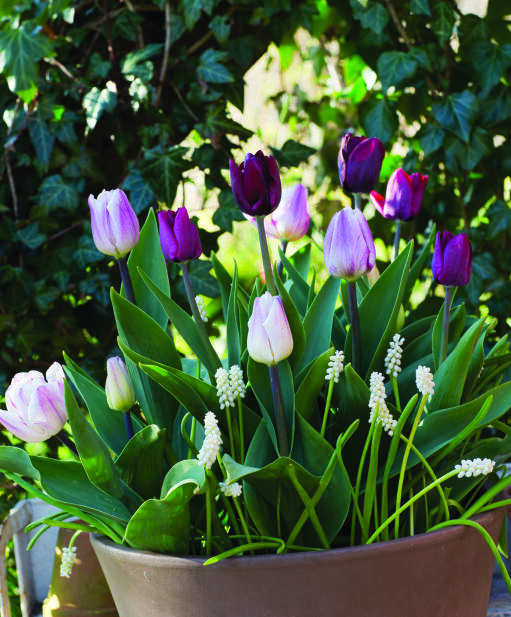 En afbalanceret farvekombination fra dæmpet vinrødt, over lillarosa toner til det hvideste hvide. Tulipanernes klassiske blomsterform fremhæves af perlehyacintens druer af kridhvide blomster. En stilfuld kombination til bedet og potten.