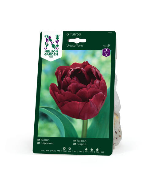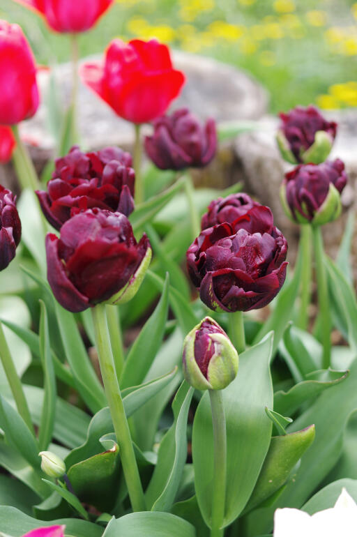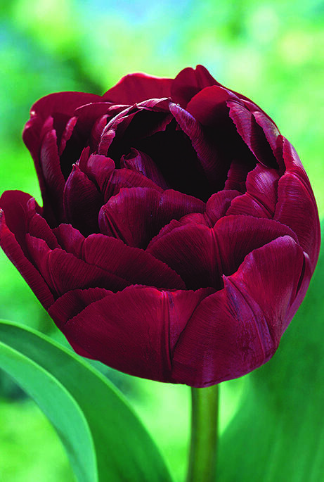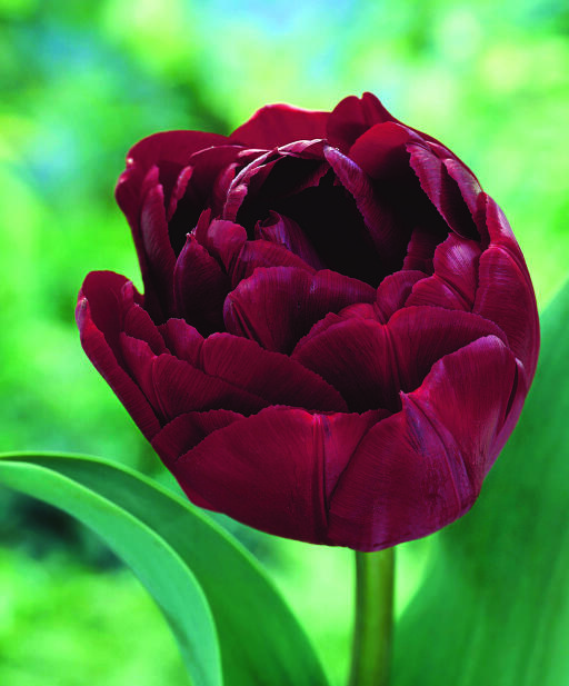 Ud af en meget mørk, næsten brun knop slår denne dybt røde tulipan sin overflod af kronblade ud. Blomsten ligner en pæon eller en rose og er vidunderlig smuk sammen med rosa eller hvide tulipaner, hvide narcisser eller blå perlehyacinter.