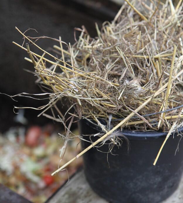3. Nu kan du begynde at tømme din kompostspand med køkkenaffald i komposten. Hver gang du tilsætter en spand med affald, tilsætter du samtidig kulstofrigt strøelse, og når beholderen begynder at blive fuld, blander du materialet ordentligt sammen. Til sidst dækker du overfladen med lidt strøelse. Strøelse kan købes i sække, men det går lige så godt at bruge savspåner, tørre blade, flis eller hakket halm. 1 del strøelse til 3 dele affald plejer at være tilstrækkeligt.